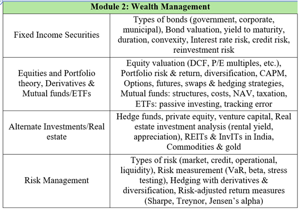 Learners develop expertise in fixed income securities, equities, portfolio theory, derivatives, and alternative investments, alongside risk management techniques to optimize wealth creation and preservation.