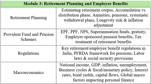 This module explores retirement solutions, provident and pension schemes, and regulatory frameworks, helping participants design sustainable retirement strategies for clients.