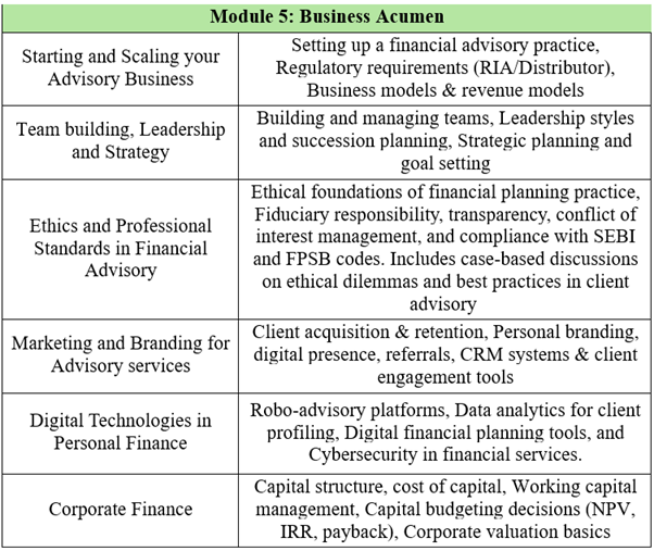However, success in this space demands more than technical knowledge. Professionals must blend finance expertise with business skills required to build a client base, a team, a brand, or a mindset for adapting to technological advancements. This course is designed to fill that gap, preparing a new generation of financial planners who can not only serve clients but also build sustainable businesses in a highly competitive and evolving market.