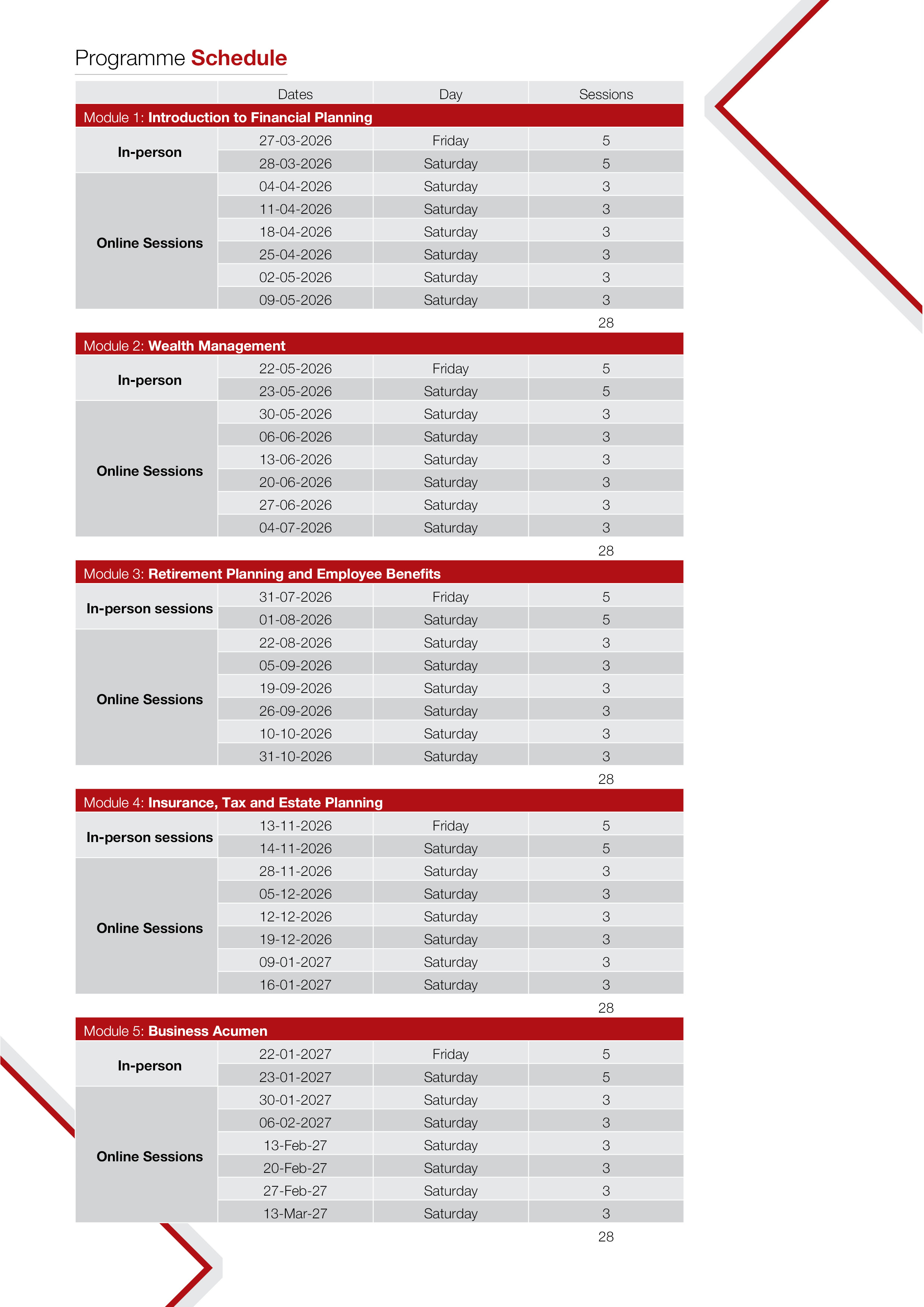 By the end of the programme, participants will have acquired technical financial expertise and honed business acumen, enabling them to deliver high-quality financial planning solutions and build successful ventures in the wealth management and personal financial advisory industry.